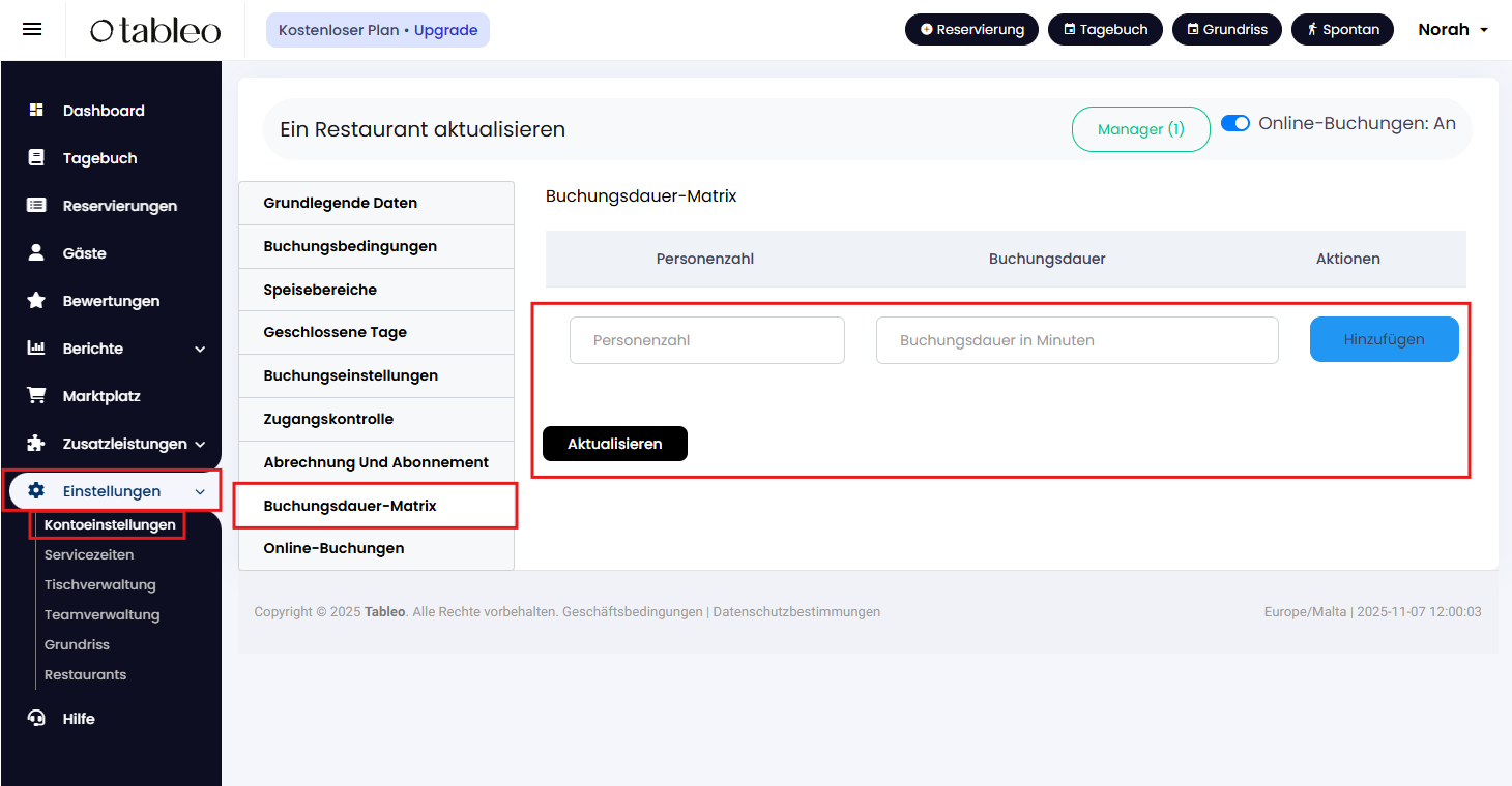 Große Tische sind schön, aber sie bleiben oft länger besetzt. Die Buchungsdauer-Matrix von Tableo ermöglicht es Ihnen, die Buchungsdauer in Minuten entsprechend der Gruppengröße festzulegen. Gehen Sie dazu wie folgt vor: