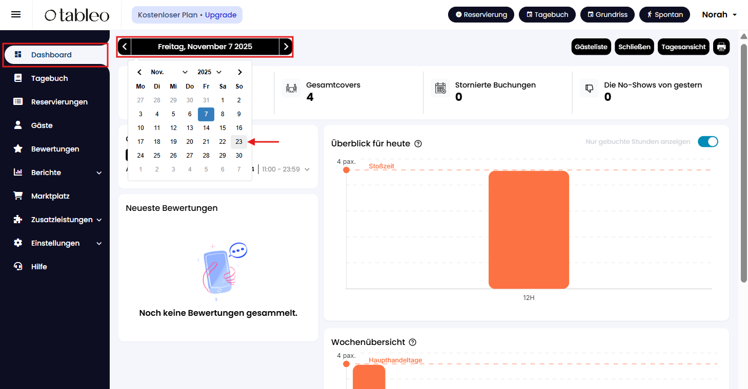 1. Klicken Sie in Ihrem Dashboard auf das Datum, um den Kalender zu öffnen.