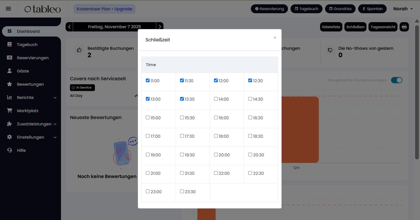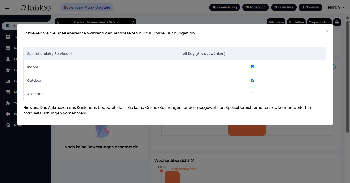 4. Wenn Sie im Abschnitt Servicezeiten die Speisebereiche auswählen, können Sie Buchungen für bestimmte Zeiten in bestimmten Bereichen stoppen.