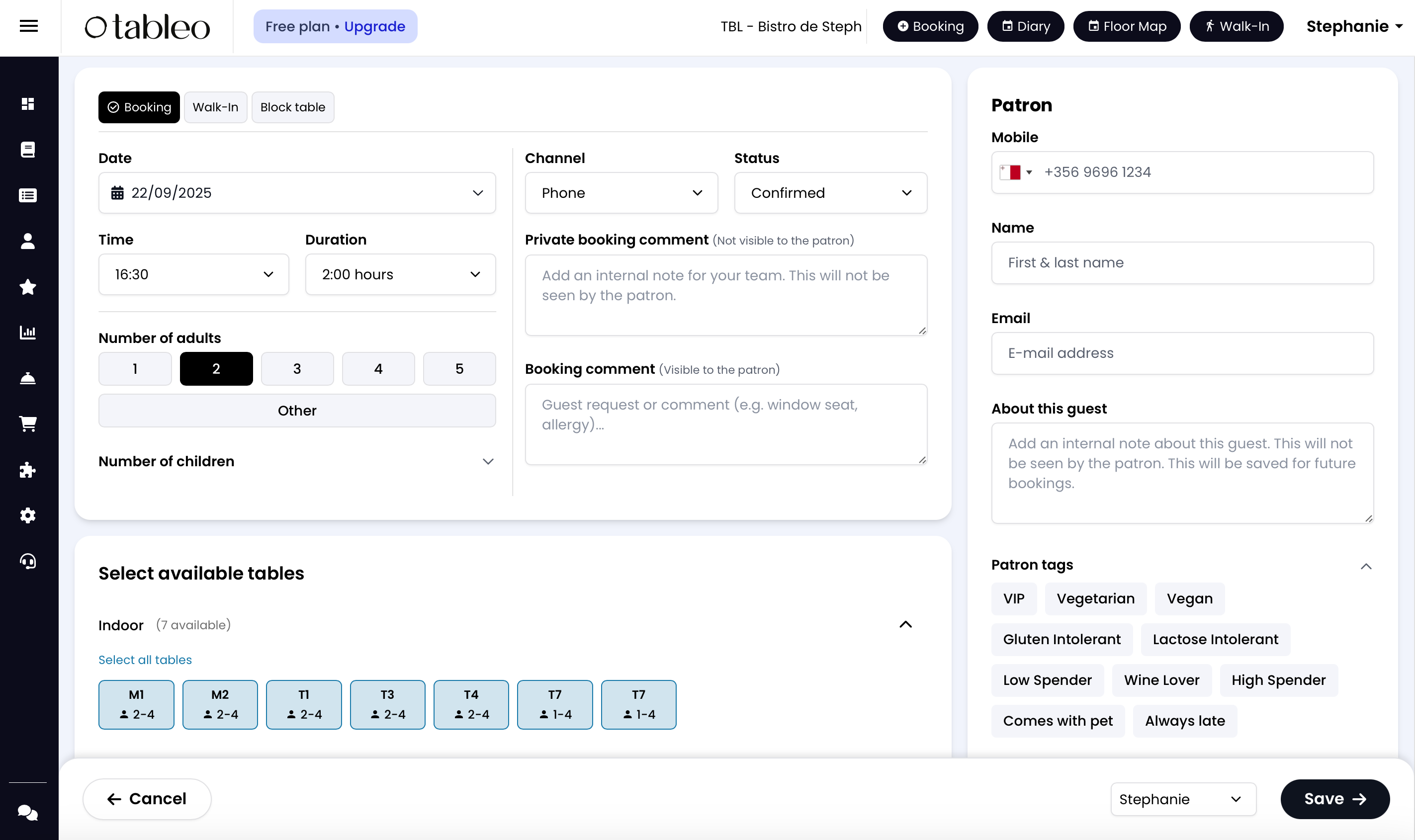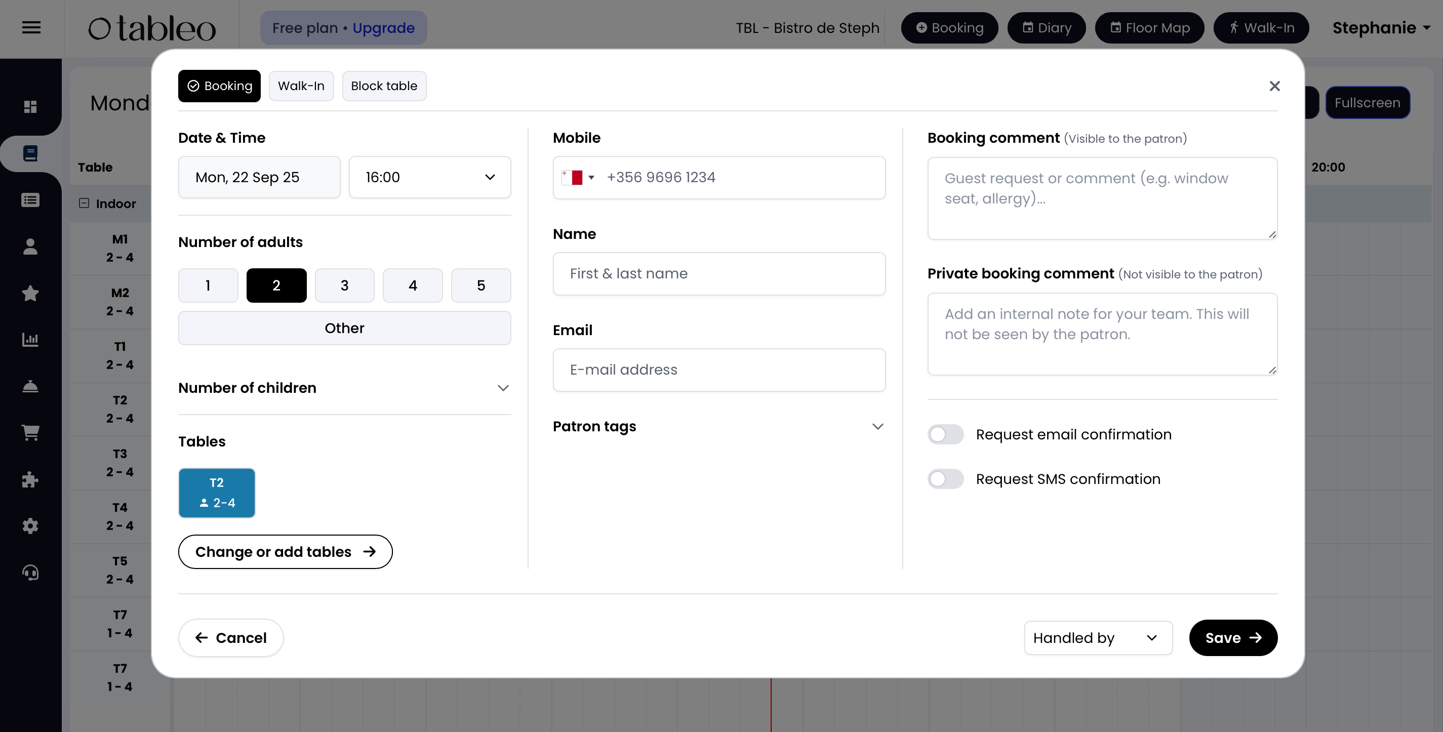 You may also choose to fill in the patron’s email address, add a private comment which will only be visible by the restaurant staff or set patron tags. With the permission of the patron, you may also choose to send out email and SMS confirmations from you to the customer.