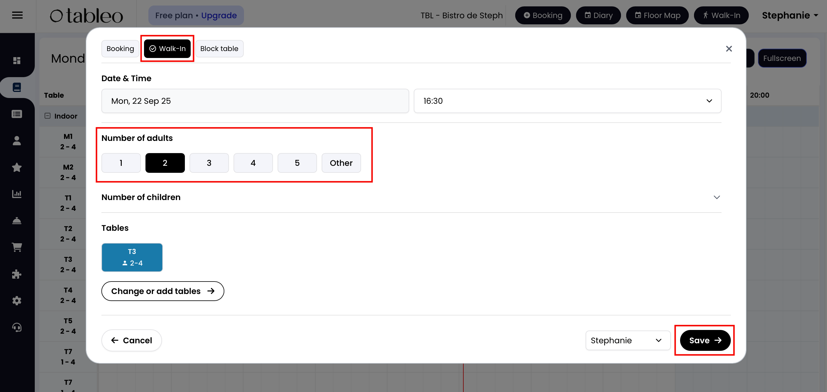 2. Click on an available slot, with the table and time you would like to block for the reservation.
