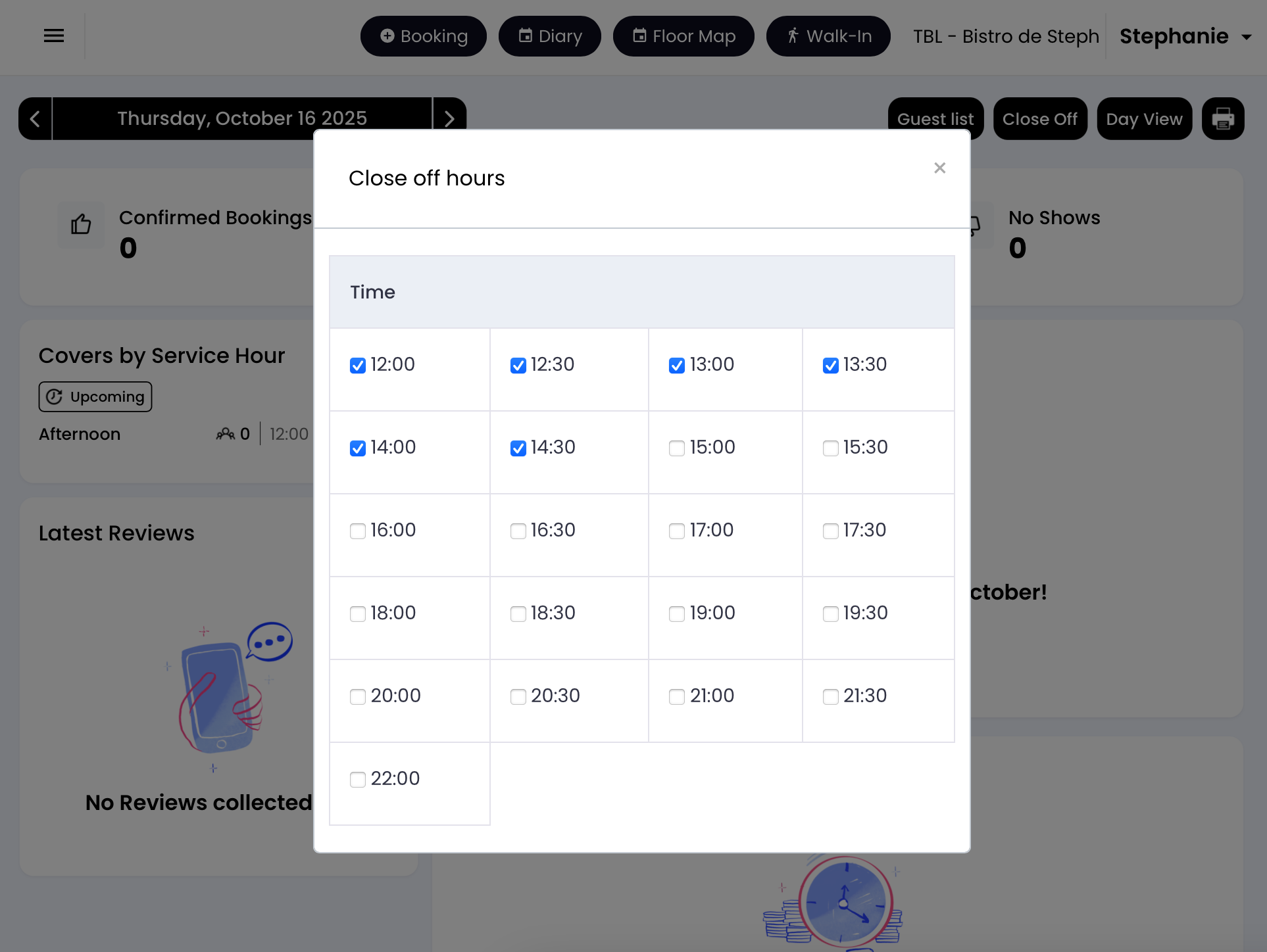 4. By selecting Dining Areas in the Service Hours you can stop booking for specific times in designated dining areas.