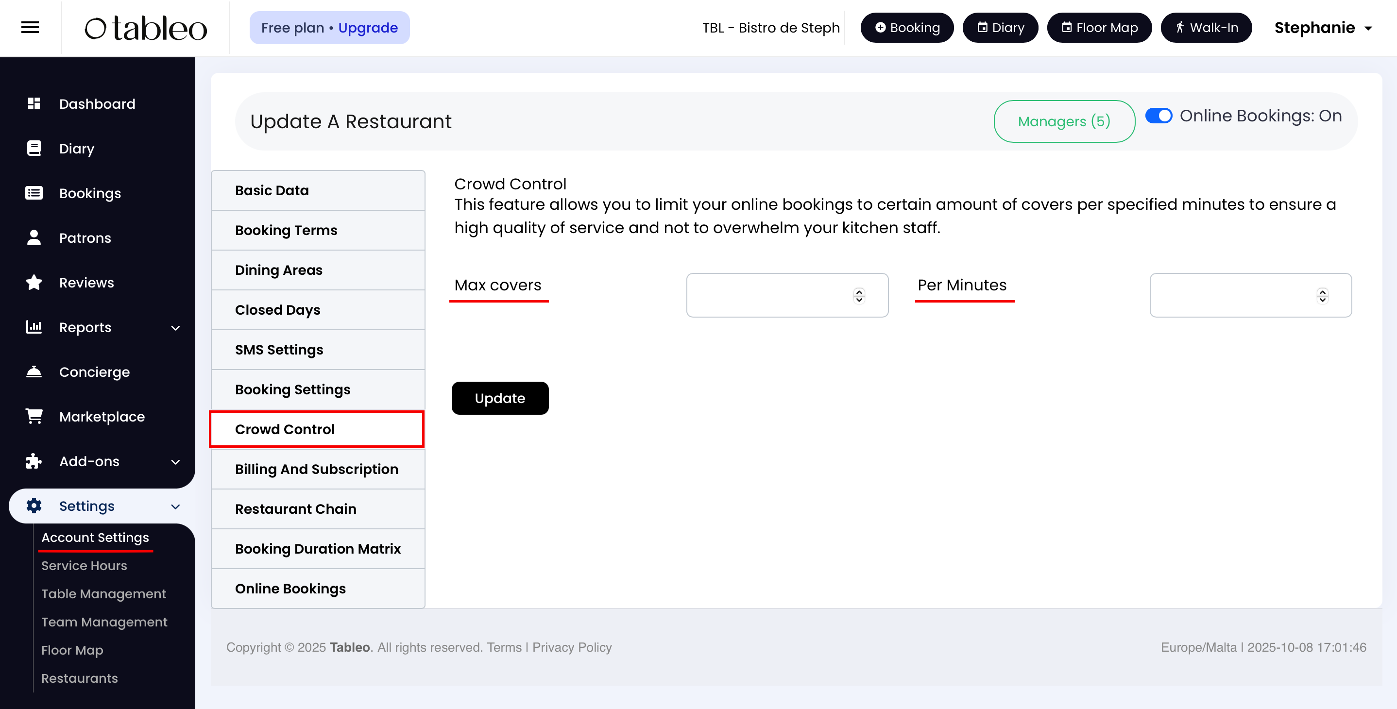 2. In the 'Maximum covers' box, enter the desired maximum number of covers to be accepted during a specific interval of time.
