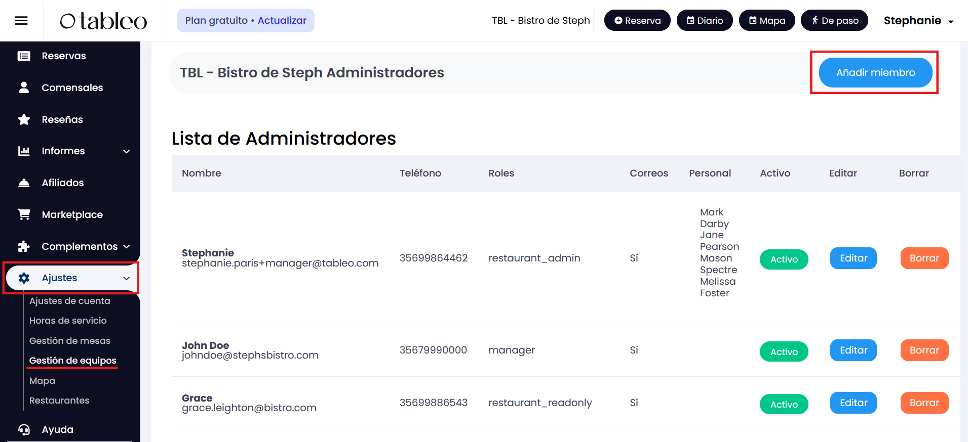 - Administrador: Tiene acceso completo a la cuenta de Tableo, incluida Configuración.