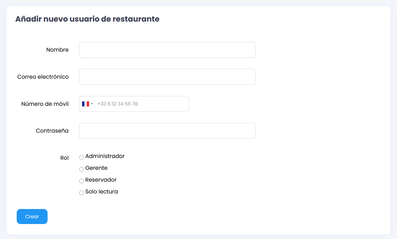 - Reservador: Solo puede crear y editar reservas creadas por esta cuenta de usuario.