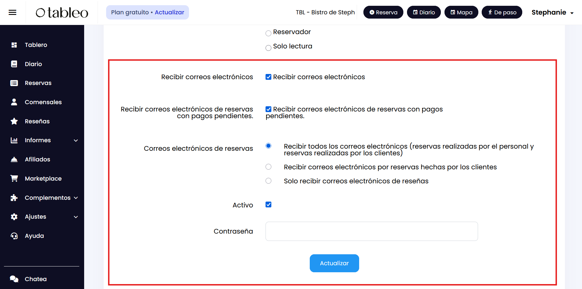 - Gerente: Tiene acceso completo a la cuenta de Tableo, excepto Configuración.