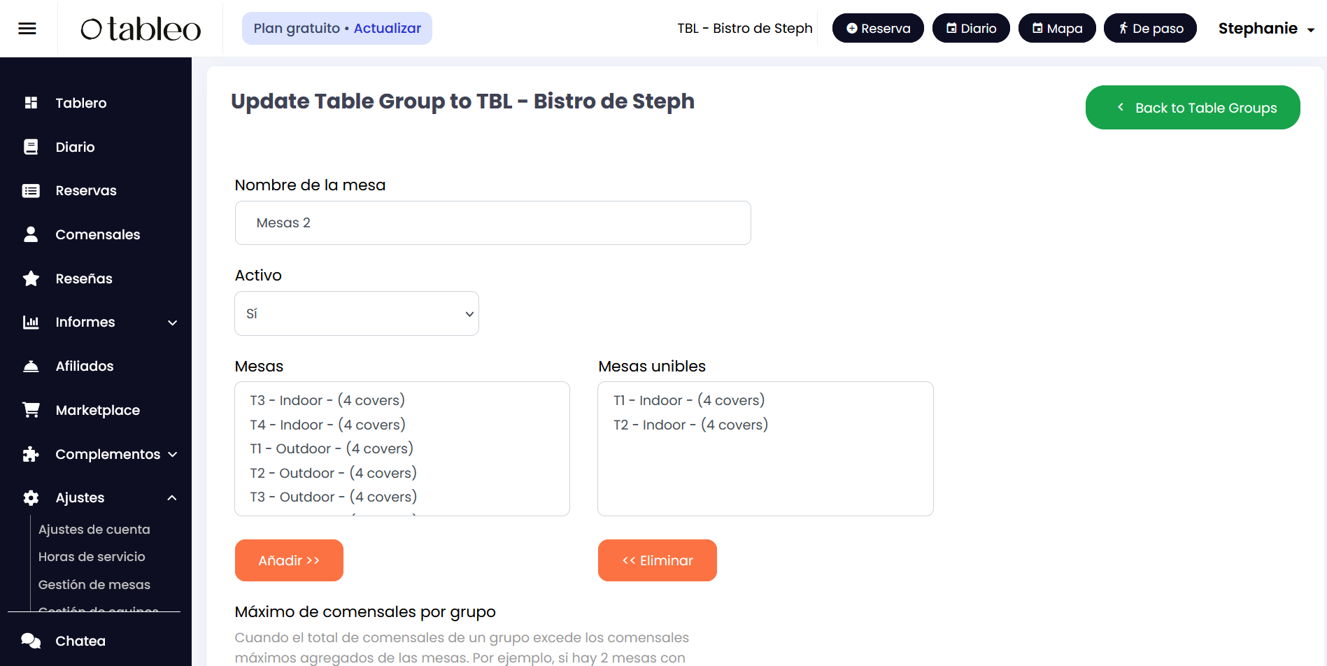 5. Una vez creado el grupo, añada las tablas que desea unir y haga clic en Guardar grupo de mesas.