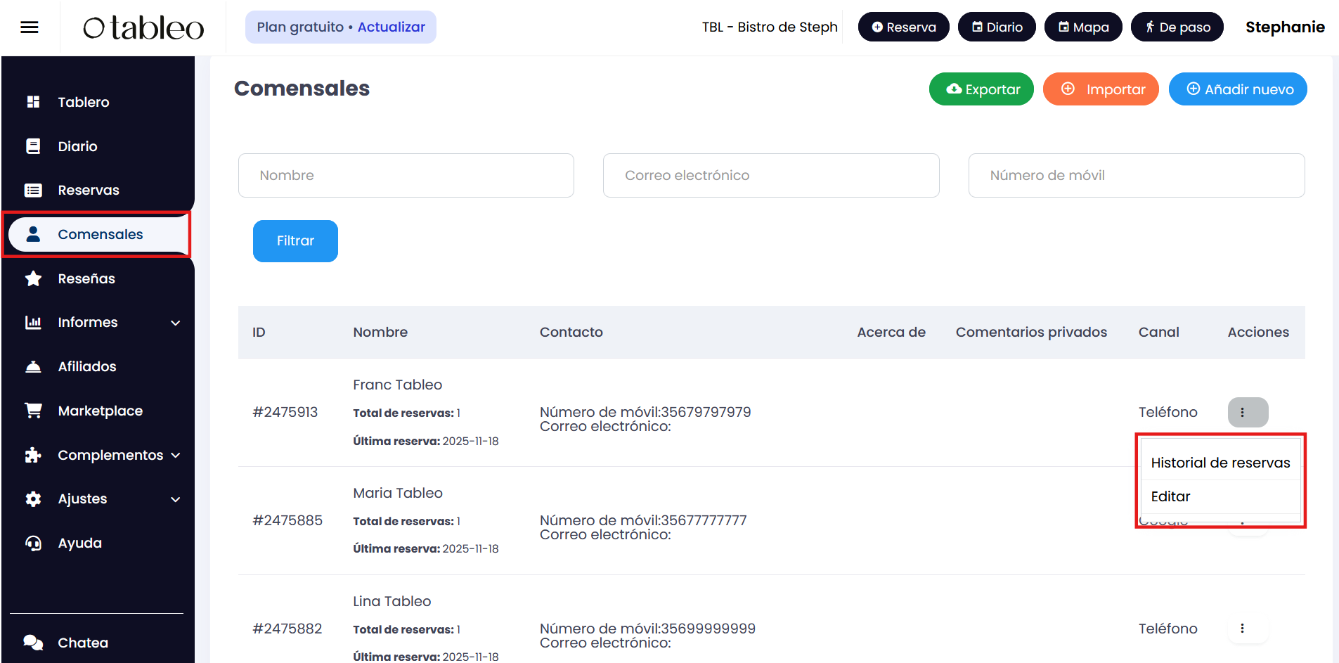 4. Elige Editar para cambiar cualquier detalle, o puedes optar por ver su Historial de Reservas.