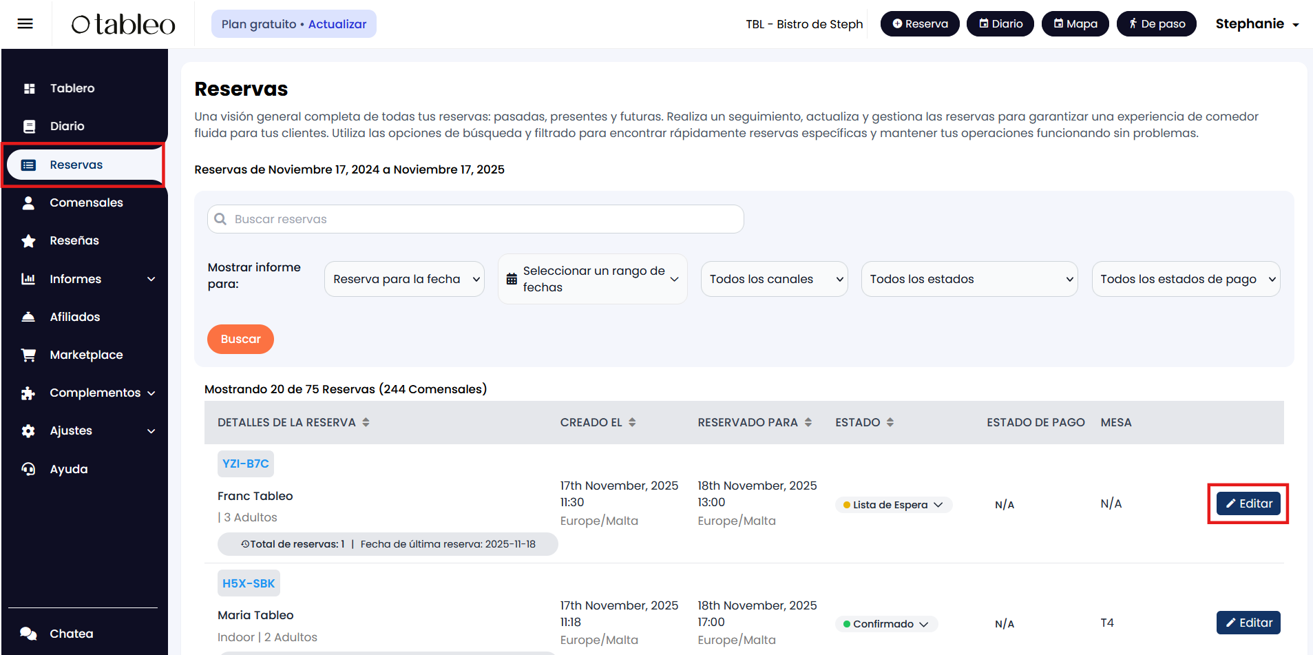 2. Selecciona la reserva que deseas marcar como ausencia y haga clic en Editar.