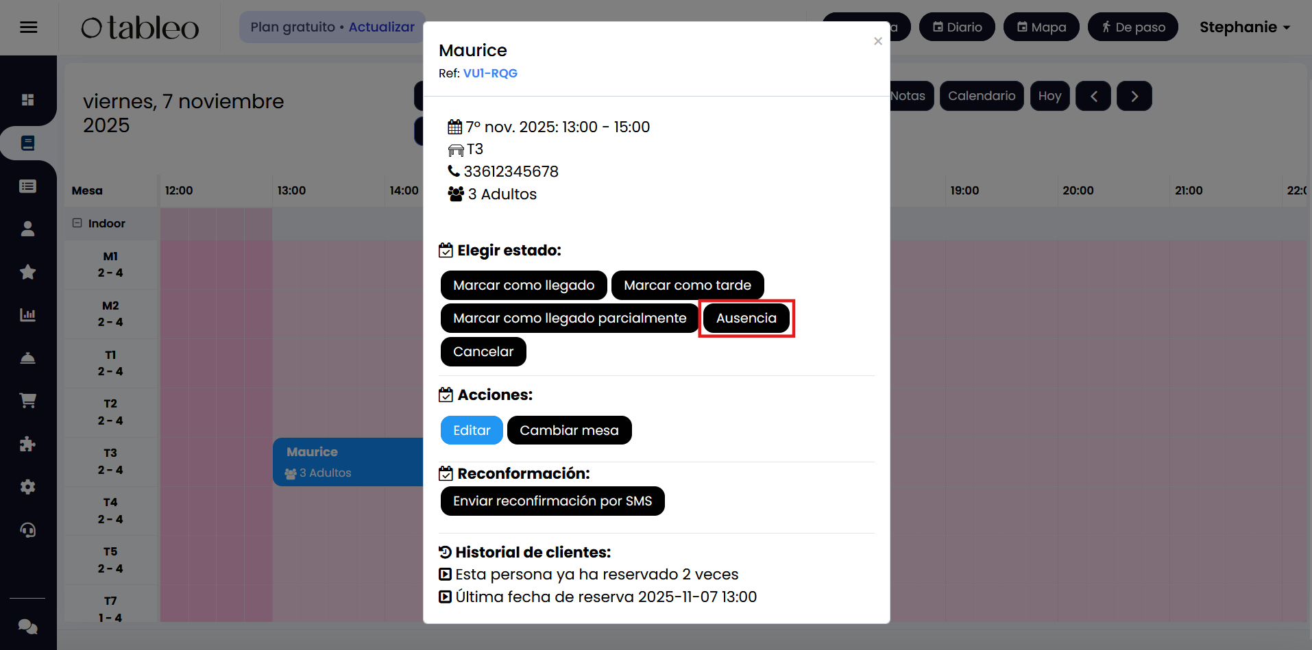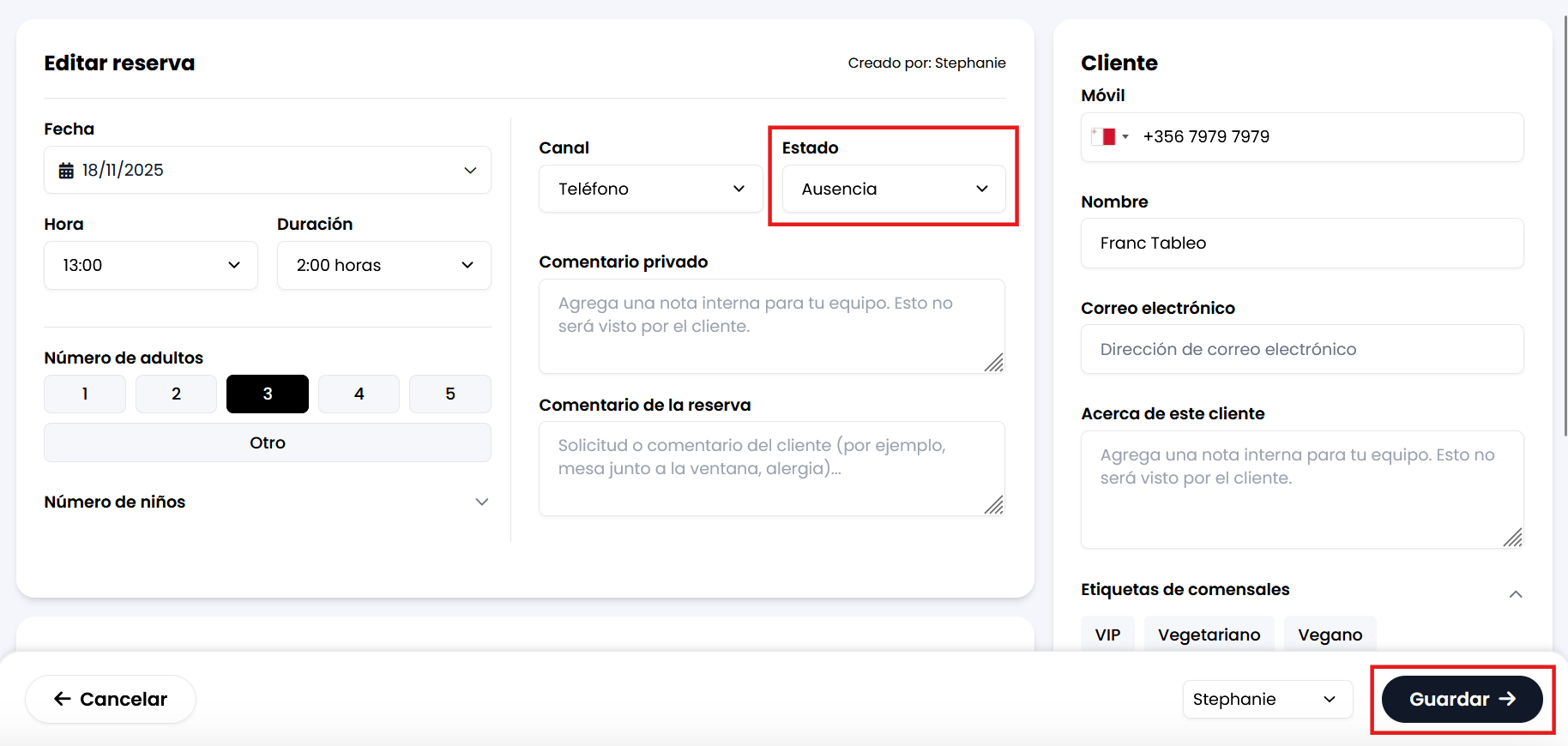 3. Cambia el Estado de la Reserva a Ausencia y haga clic en Guardar.