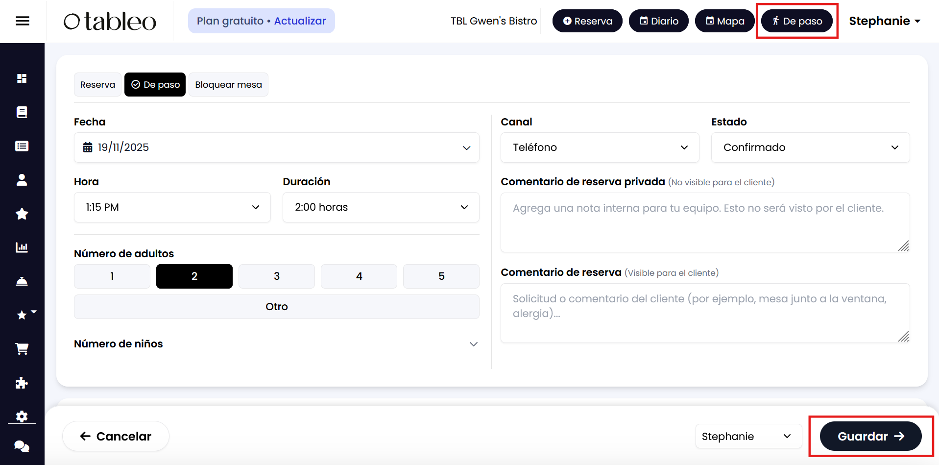4. Ingresa los detalles necesarios para la reserva y haz clic en ‘Guardar’.