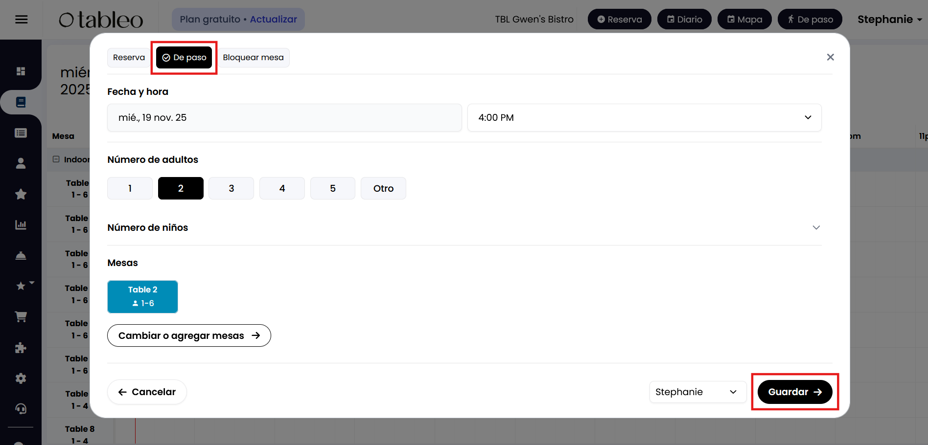 3. Cuando aparezca el cuadro emergente, marca la reserva como ‘De paso’.