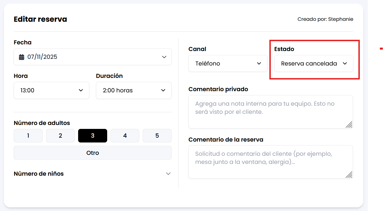3. Cambie el estado a ‘Reserva cancelada’ y haga clic en Guardar.
