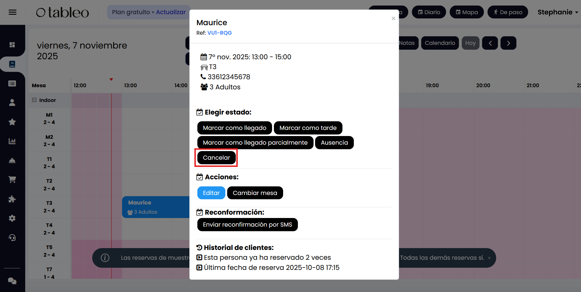 3. Haga clic en la reserva y establezca el estado en Cancelar.