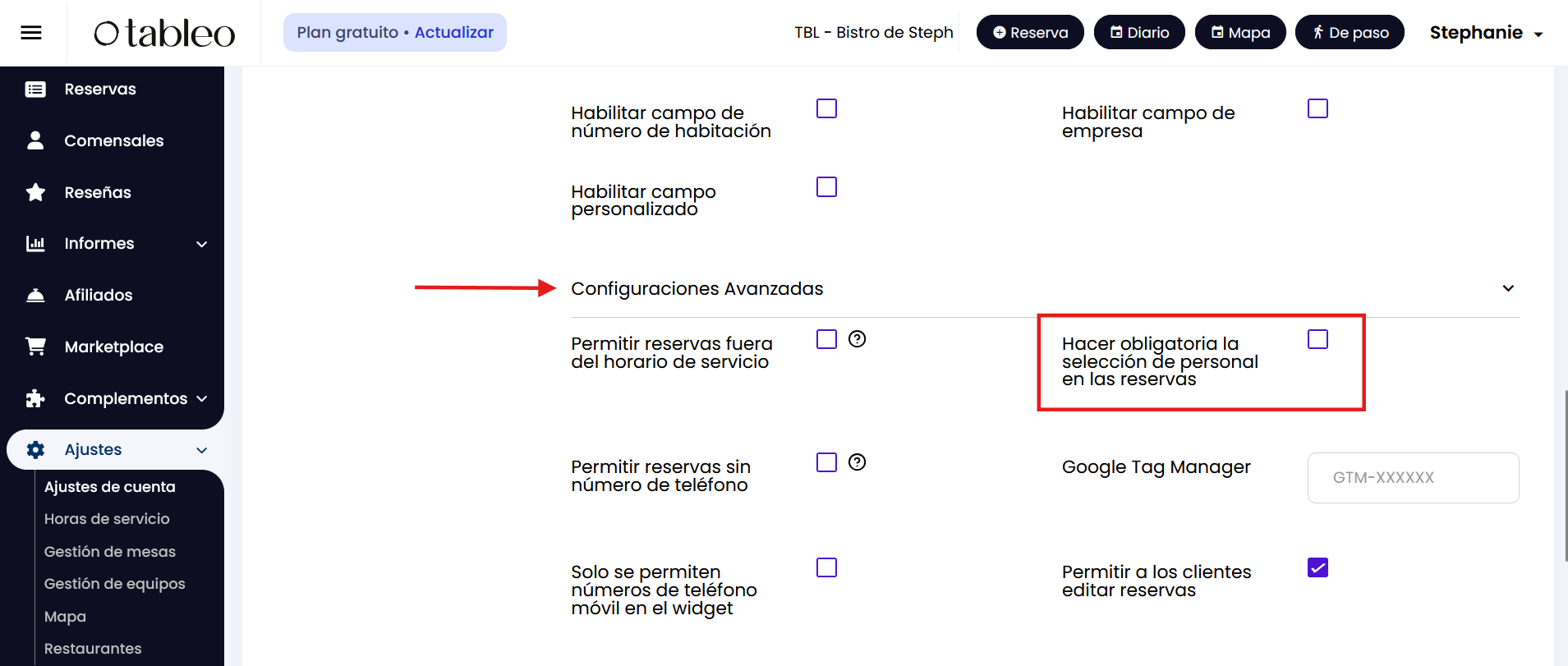 Desplácese hacia abajo hasta Configuraciones Avanzadas, ábrala y seleccione la casilla ‘Hacer obligatoria la selección de personal en las reservas’.