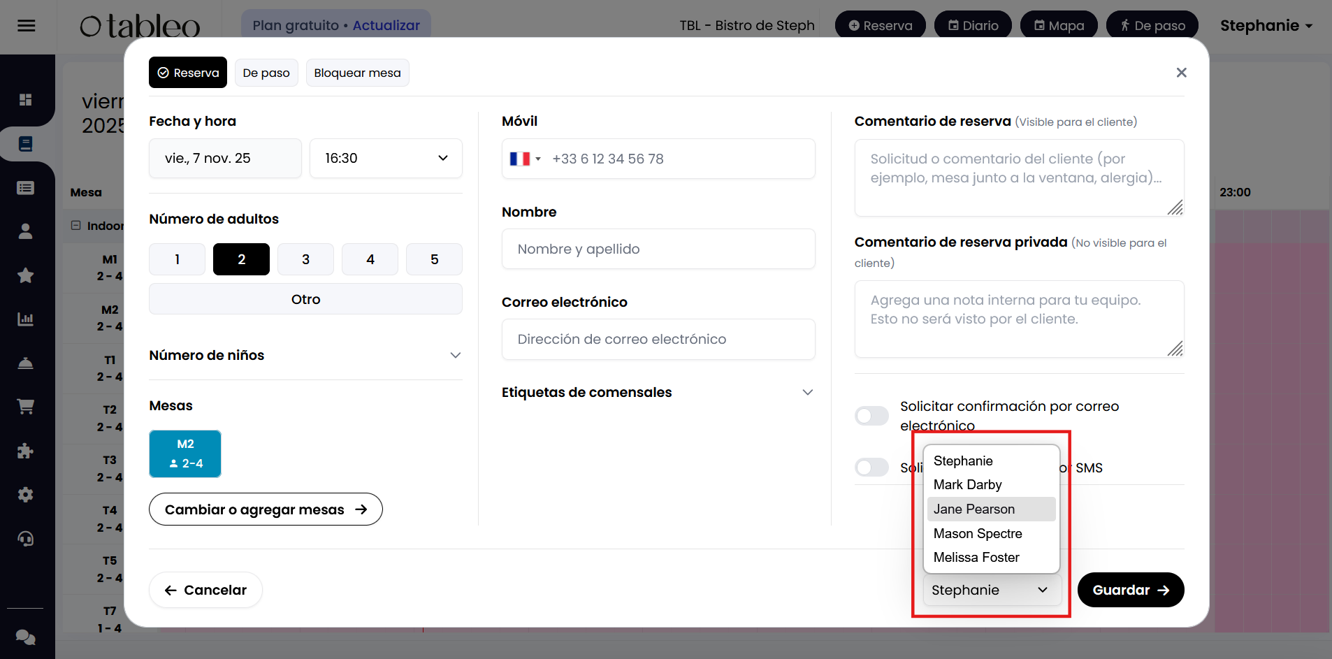 Ahora, cuando un miembro del personal cree o edite una reserva, se le pedirá que seleccione su nombre en el formulario de reserva.