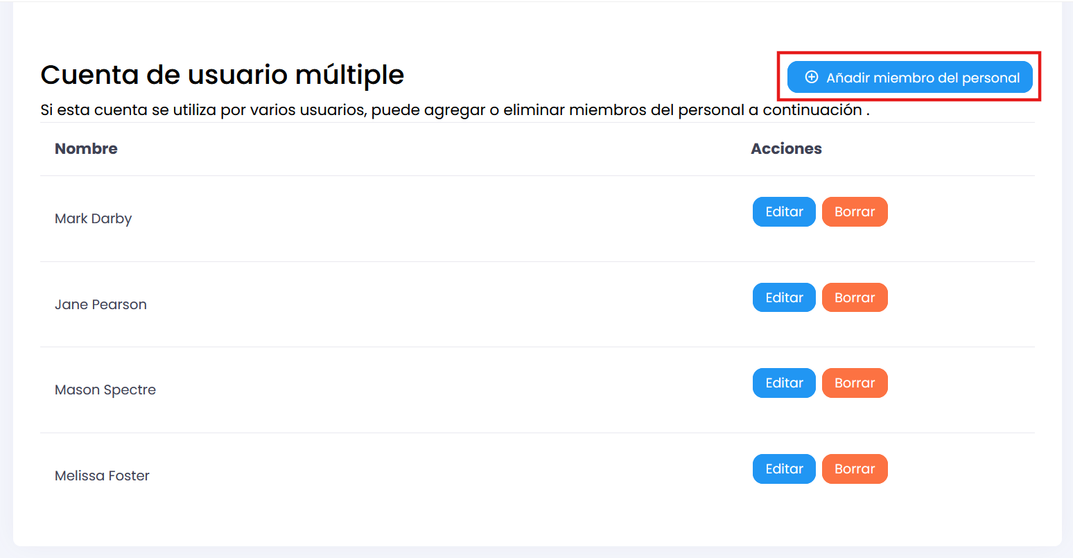 Haz clic en "Añadir miembro del personal" para introducir a los miembros del personal que pueden editar reservas en tu nombre.
