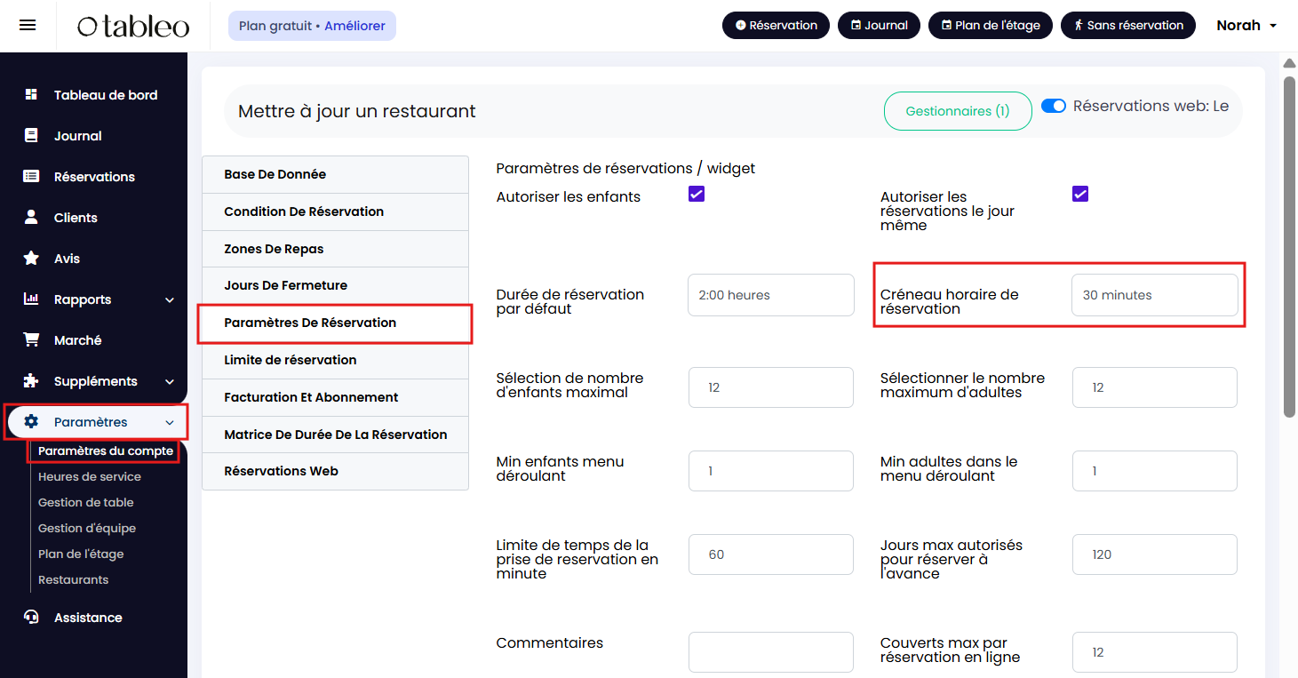 1. Dans le menu latéral, allez dans Paramètres > Paramètres du compte > Paramètres De Réservation.
