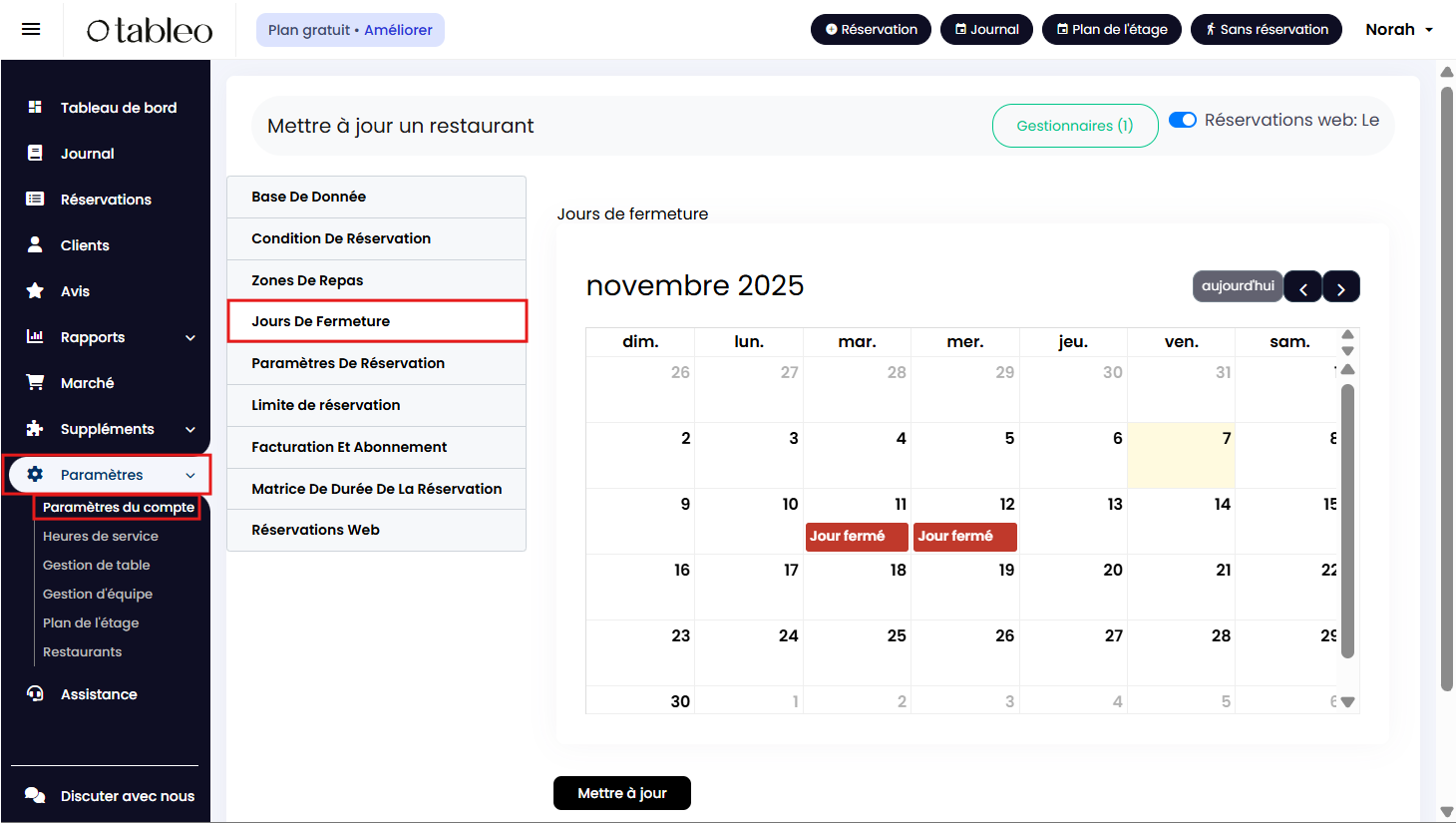 1. Depuis le menu à gauche, cliquez sur Paramètres > Paramètres du compte > Jour De Fermeture.
