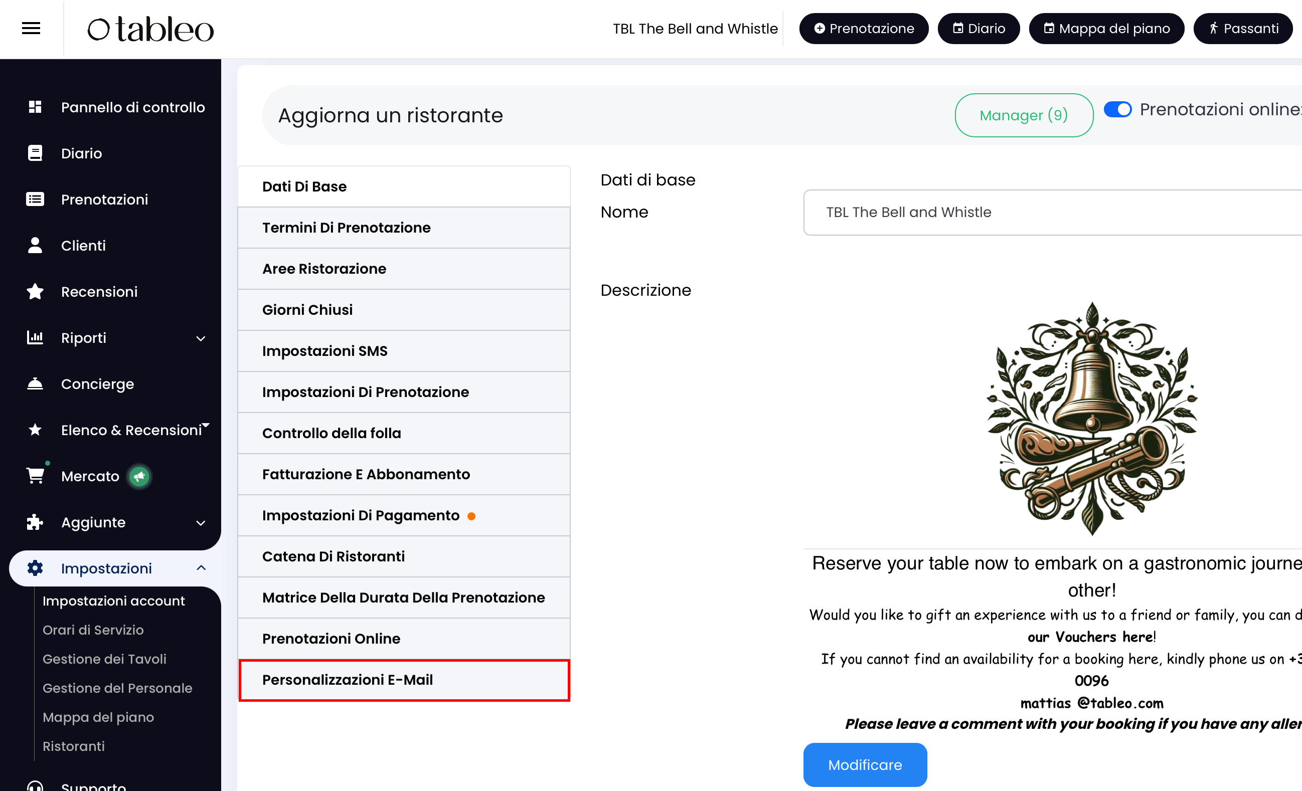 Con Tableo puoi personalizzare le email di conferma e i promemoria inviati automaticamente ai tuoi clienti e ai gestori del tuo ristorante — per riflettere pienamente l’identità del tuo brand.