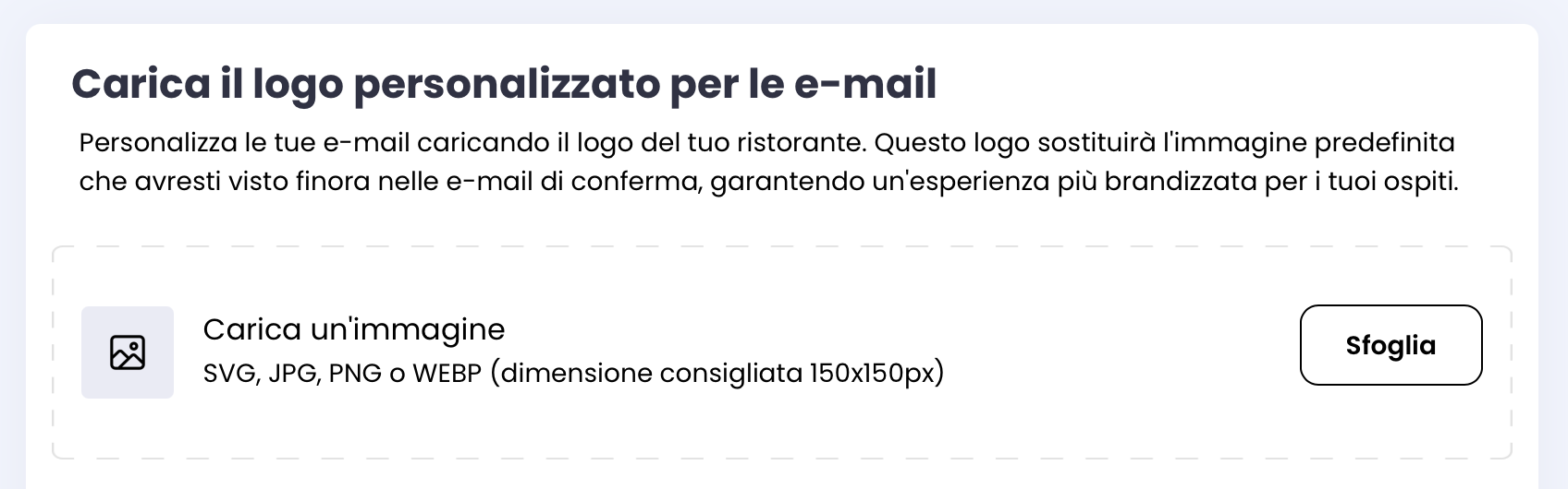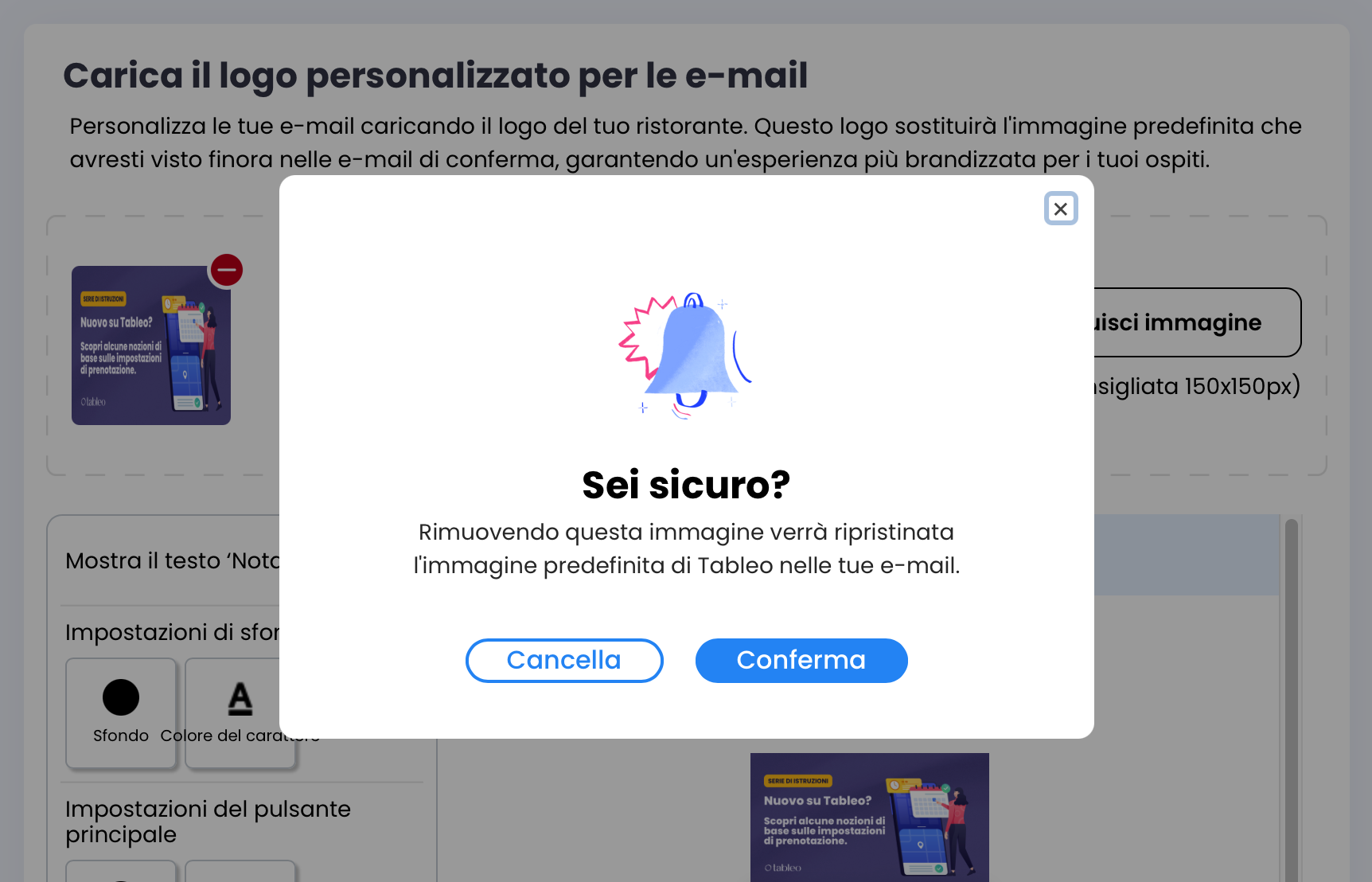 Caricando il tuo logo, sostituirai il logo predefinito di Tableo presente nelle email in uscita. Ti verrà chiesto di confermare prima di completare la sostituzione.